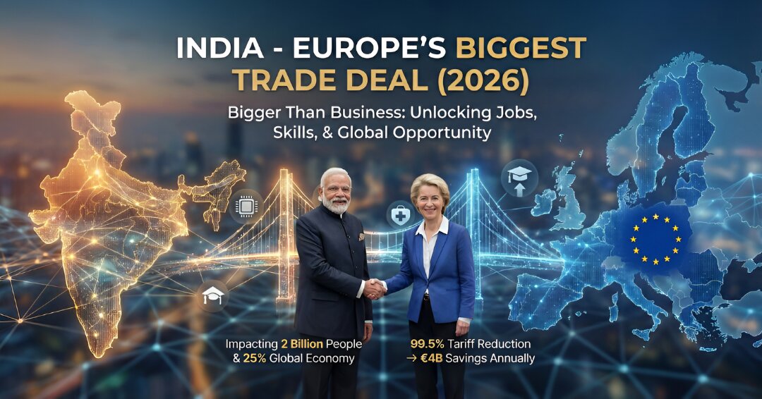 The agreement connects 27 European countries and India, impacting nearly 2 billion people and 25% of the global economy. It makes business cheaper and easier, especially in technology, healthcare, manufacturing, pharma, and services.